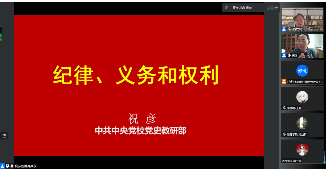 祝彦教授紧紧围绕全面从严治党这一治党治国的重要原则,从遵守纪律、履行义务和行使权利三个方面讲授了课程,他着重指出,纪律严明是党的一贯传统,从严治党是党的一贯坚持;并带领学生党员回顾了从严治党的历程,重温习近平总书记对全面从严治党的阐述;最后,祝彦教授引用党的二十大《中国共产党章程》第一章,再次向同学们解读了党员应履行的义务和享有的权利。