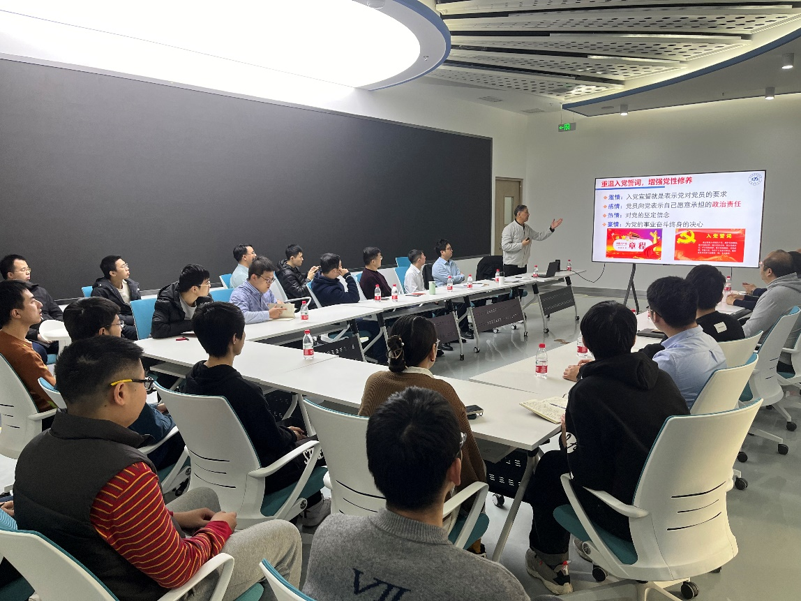 陈老师的讲座得到了在场师生的积极响应。万维锋老师结合自己的入党经历,围绕誓词主题发言。他说:面对鲜红的党旗宣誓,是一名共产党员一生中最光荣最值得纪念的时刻;要始终坚持“不忘初心”,牢记共产党员的使命;作为一名新党员,要牢固树立“四个意识”,坚定“四个自信”,坚决做到“两个维护”,用习近平新时代中国特色社会主义思想凝心铸魂。王振宇等同志表示,通过这次活动更加深刻地认识到一名共产党员的责任和使命,增强了党性修养,提高了思想政治素质;在今后工作中,更加努力地为党和人民的事业奋斗。