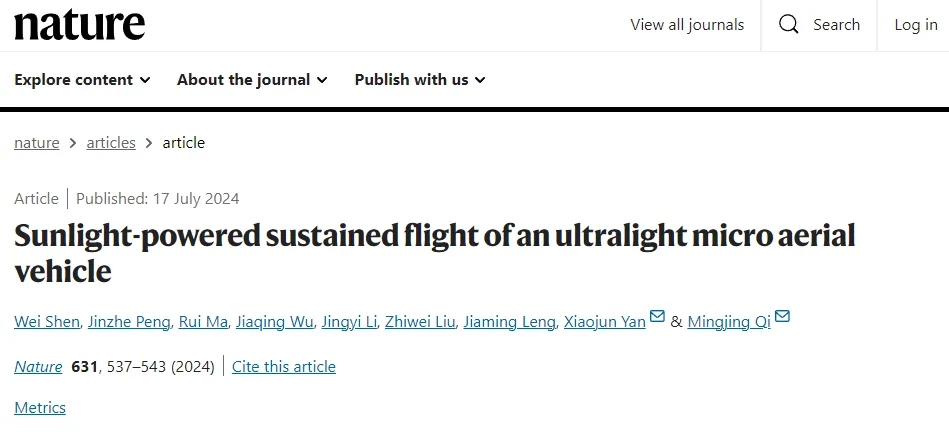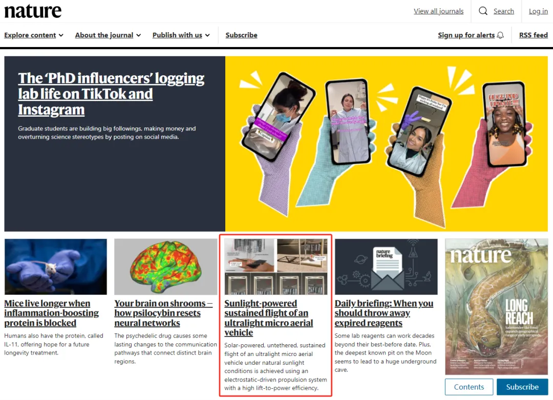 最新研究成果,北航研制新原理发动机——自然光即可实现持续飞行的静电飞行器,北航365(VIP)英国上市公司漆明净、闫晓军等,相关成果以Article形式在线发表于《Nature》杂志,并同时获Nature和Science首页推荐。