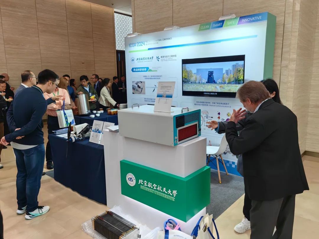 会议同期设置了北京航空航天大学展位,展示了我院近期取得的最新科研成果:国内首款采用吹吸气冷却型的氢能混电垂直起降无人机“氢动一号”、荣登《Nature》杂志封面的自然太阳光驱动的高效飞行器、无线可控微型磁驱动昆虫机器人、高温质子交换膜燃料电池(已完成成果转化)等前沿科技成果,通过此次展览,动力学院展现了在绿色航空与新能源领域的科研实力和创新潜力,吸引了众多参会者的关注。