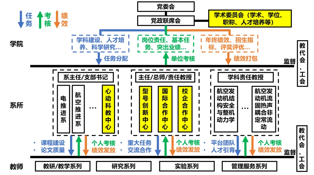 全面推进学院综合改革,突出党建重引领、学科重交叉、科教重融合、治理重协同,横向打通要素,纵向压实责任,建立“任务-考核-绩效”强关联机制和内涵导向的资源配置机制。以重点问题和短板弱项为突破口,开展体制机制改革;以学科平台团队一体化建设为中心,统筹资源配置;以关键办学指标为牵引,细化落实各级岗位职责;以完成度和贡献度为标准,实施考核及薪酬绩效管理。建强基层教学组织,成立型号创新中心、校企合作中心、国际合作中心,调整学术委员会组成。与7类团队共46位团队负责人签订目标任务书。下放考核自主权,激发各系及学科方向教学科研活力。关键指标完成率达到87.5%。