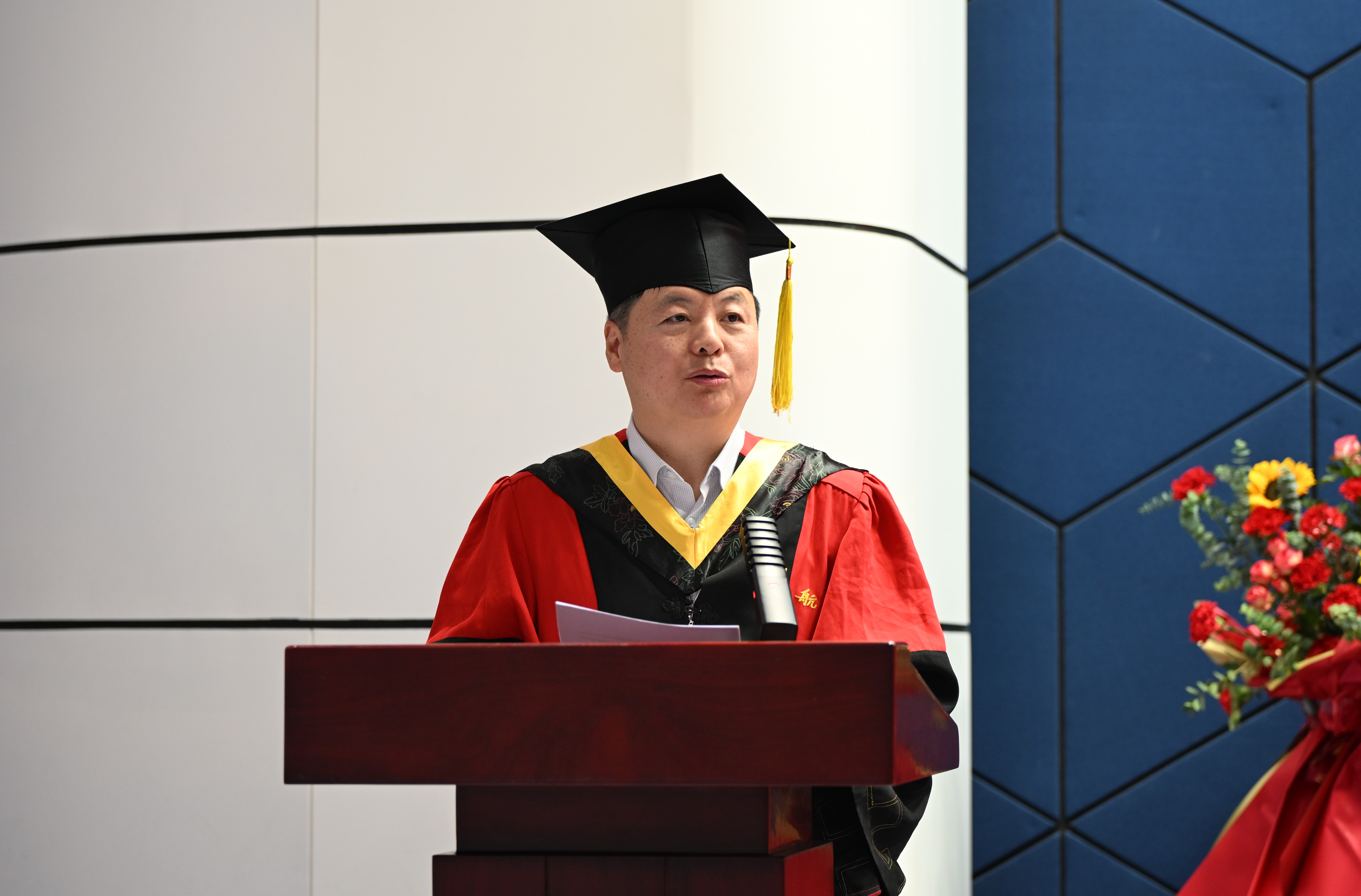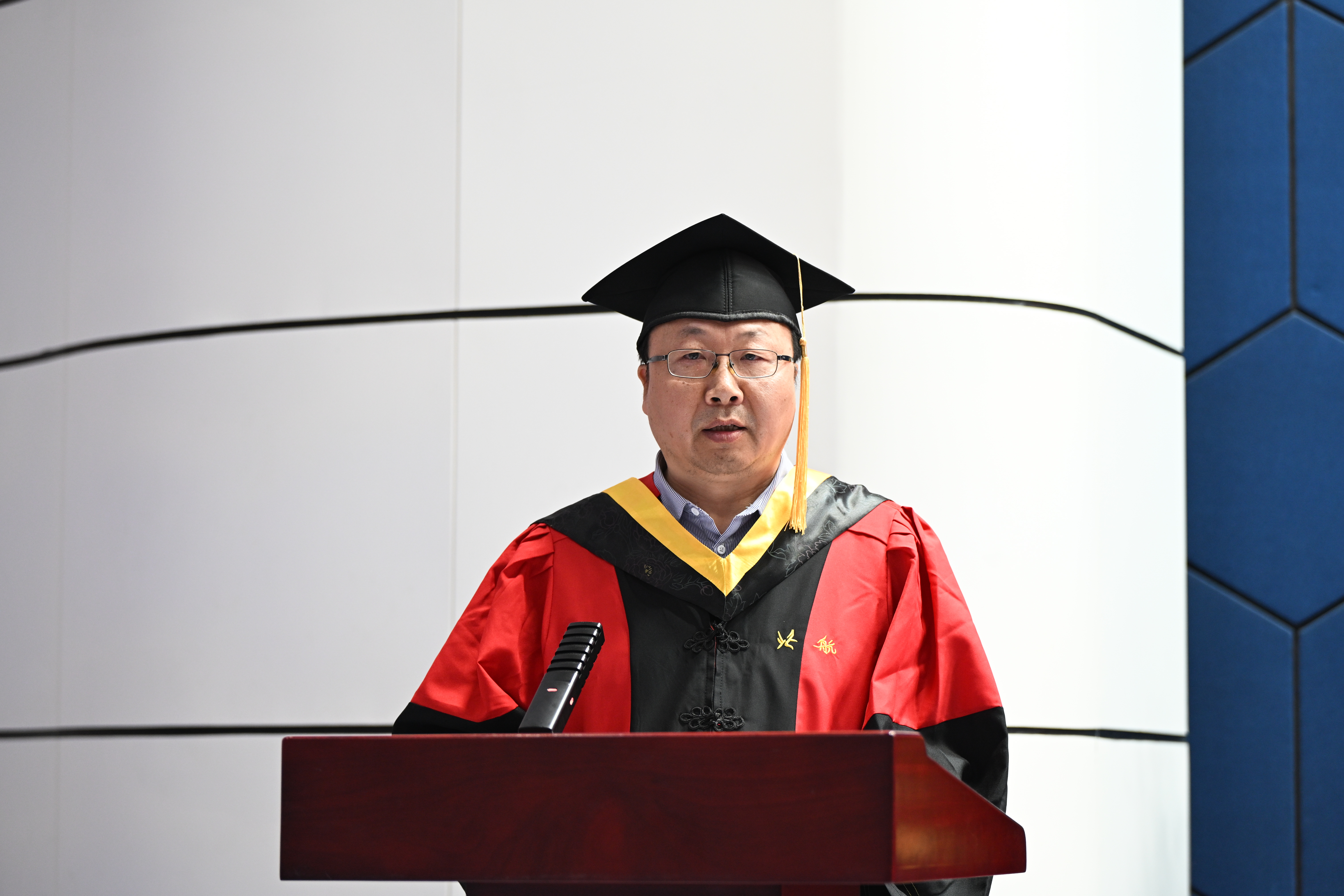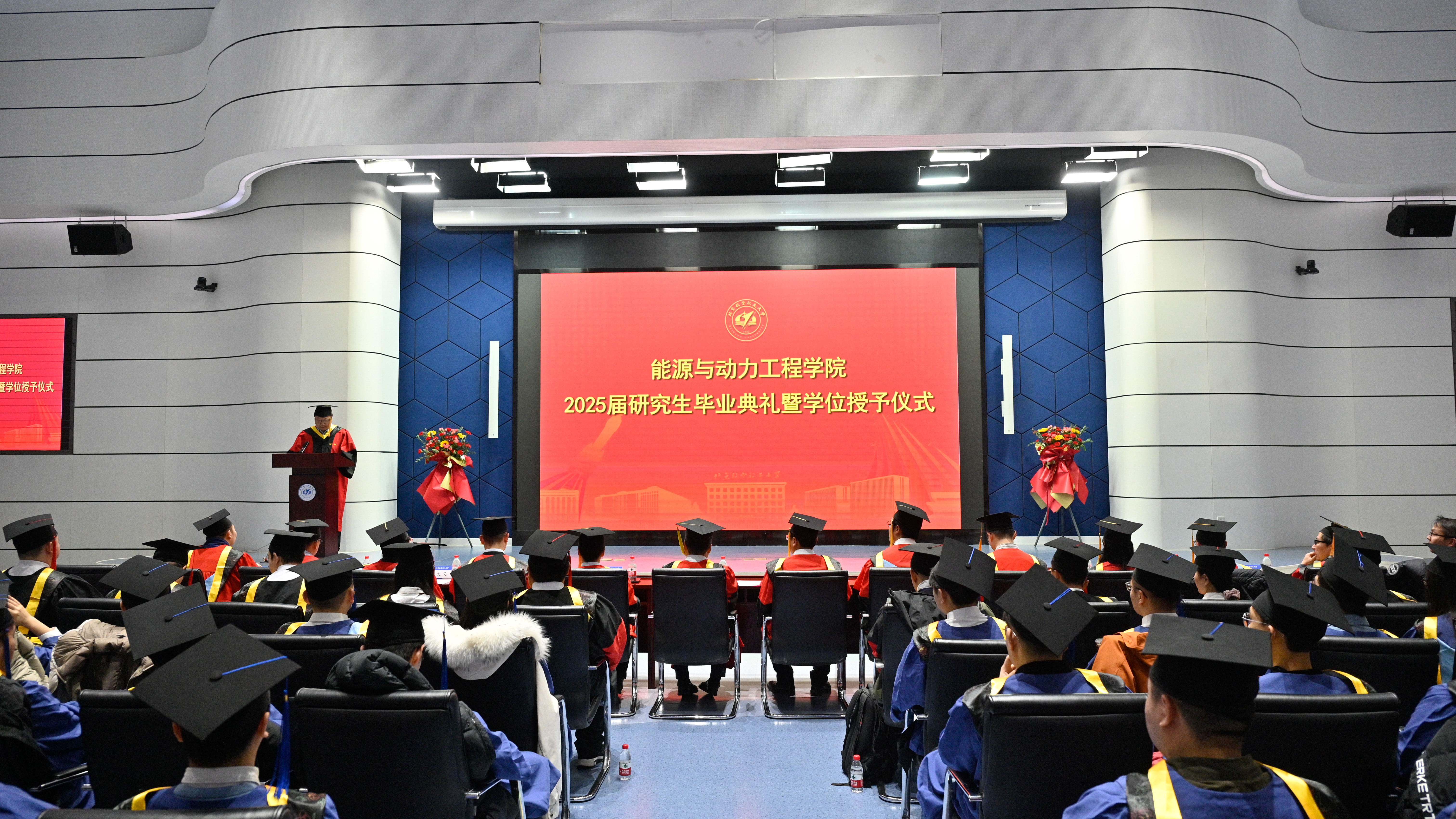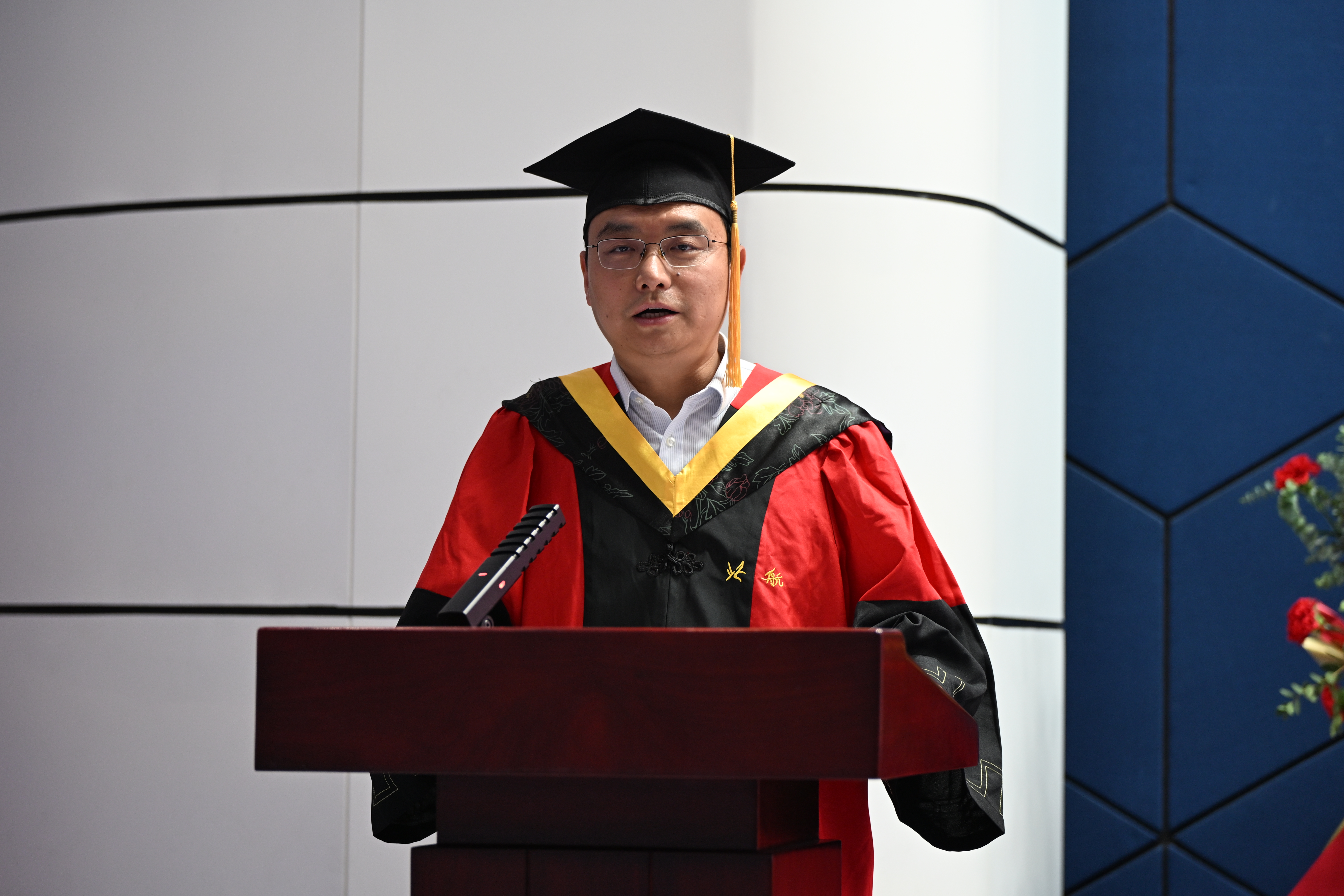 学院院长闫晓军代表学院向顺利完成学业的硕士及博士毕业生表示热烈祝贺,向辛勤付出的研究生导师和教职员工致以衷心的感谢。他回顾了这几年动力学子与国同行所经历的大事,肯定了同学们勇敢追梦、全面发展。闫晓军提出三点希望与2025届研究生毕业生共勉:第一,爱党报国,从校史院史中汲取奋进力量。人生的理想各有不同,但胸怀“国之大者”,服务国之所需,无疑是最为高远的志向。第二,终身学习,从勇于实践中锤炼过硬本领。“学如逆水行舟,不进则退”,把勤奋学习作为价值追求和人生态度。第三,团结拼搏,在凝聚力量中开创美好未来。“独行者速,众行者远”,希望大家传承好北航人团结拼搏的光荣传统,争做团结拼搏的奋斗者。