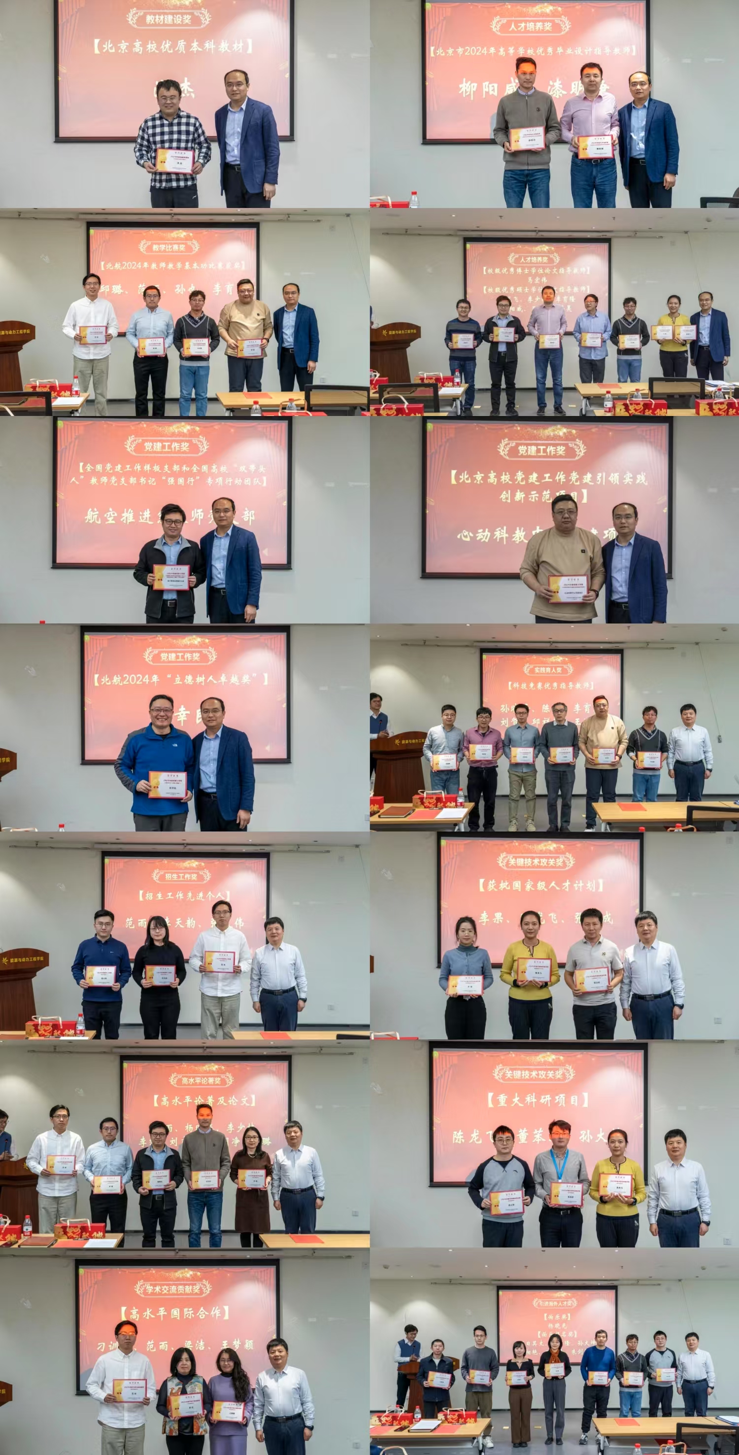 李挺宣读了学院2024年各项工作做出突出贡献的教职工名单。学院领导分别为获得教材建设奖、人才培养奖、教学比赛奖、党建工作奖、实践育人奖、招生工作奖、关键技术攻关奖、高水平论著奖、学术交流贡献奖、引进海外人才奖等获奖教职工颁奖。