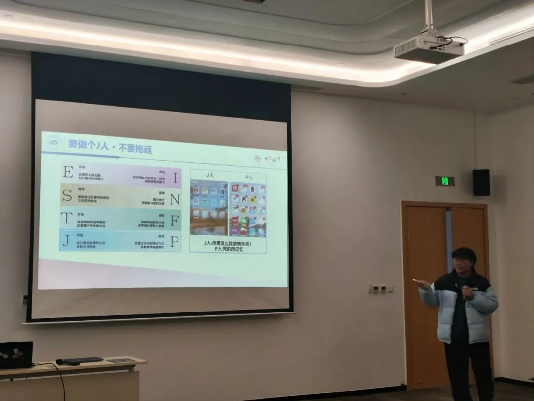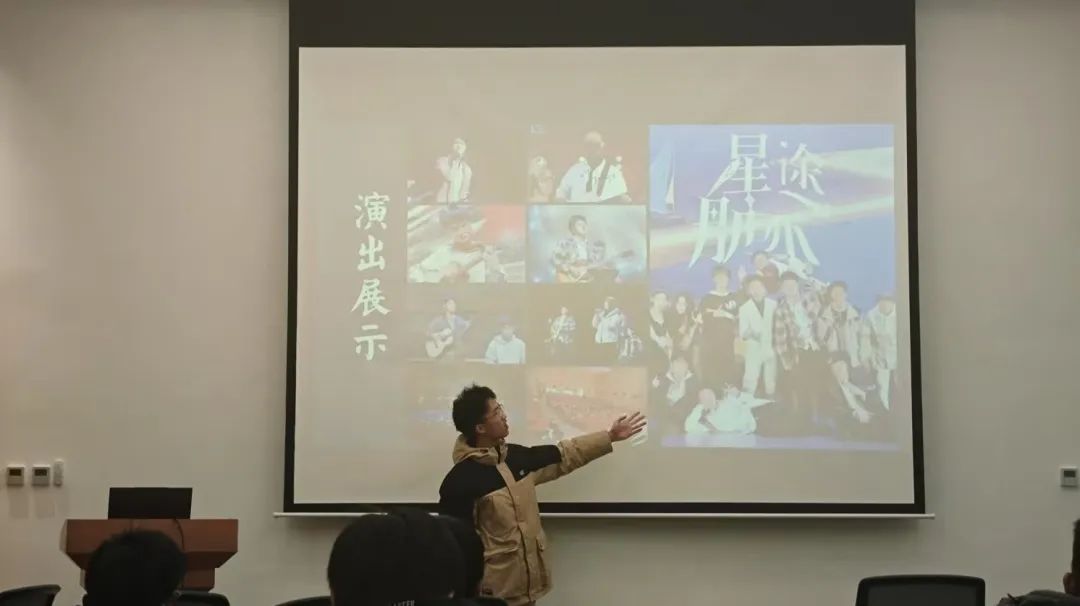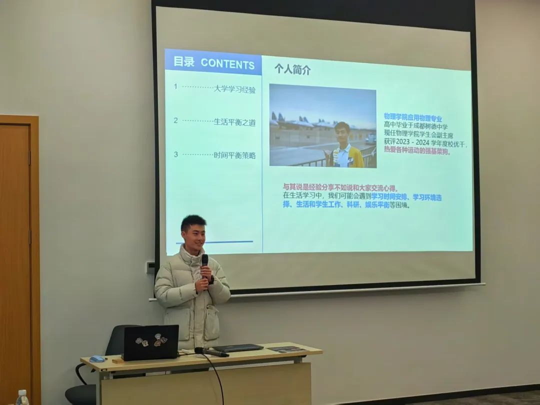 曹家豪同学以自己的乐队经历和击剑课程为切入点,生动地讲述了大学生活。他幽默风趣的语言,搭配丰富的图片与视频,让学弟学妹们仿佛身临其境,真切感受到大学生活的无限精彩。