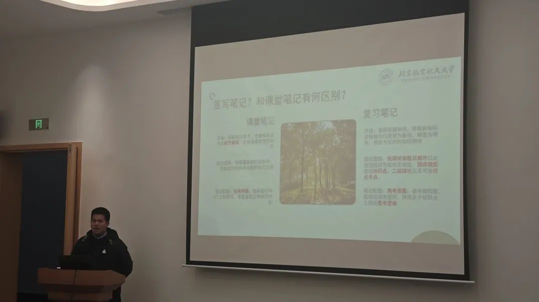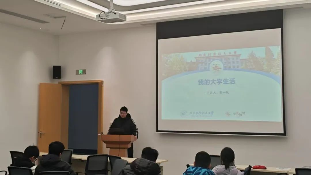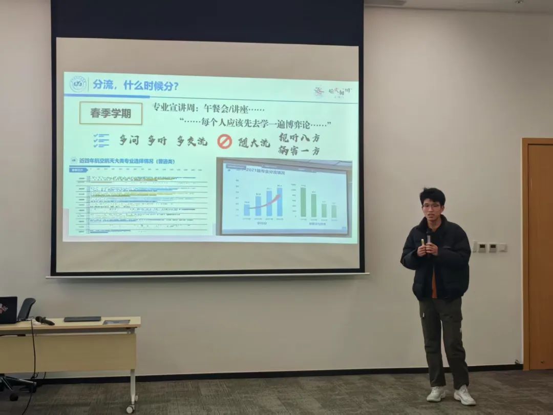 王睿琦同学在介绍社团活动之外,着重分享了北航特色的导学活动与梦拓计划。他结合自身经历,深入浅出地阐述了资源与渠道对学习的重要性,为学弟学妹们拓宽了学习思路。