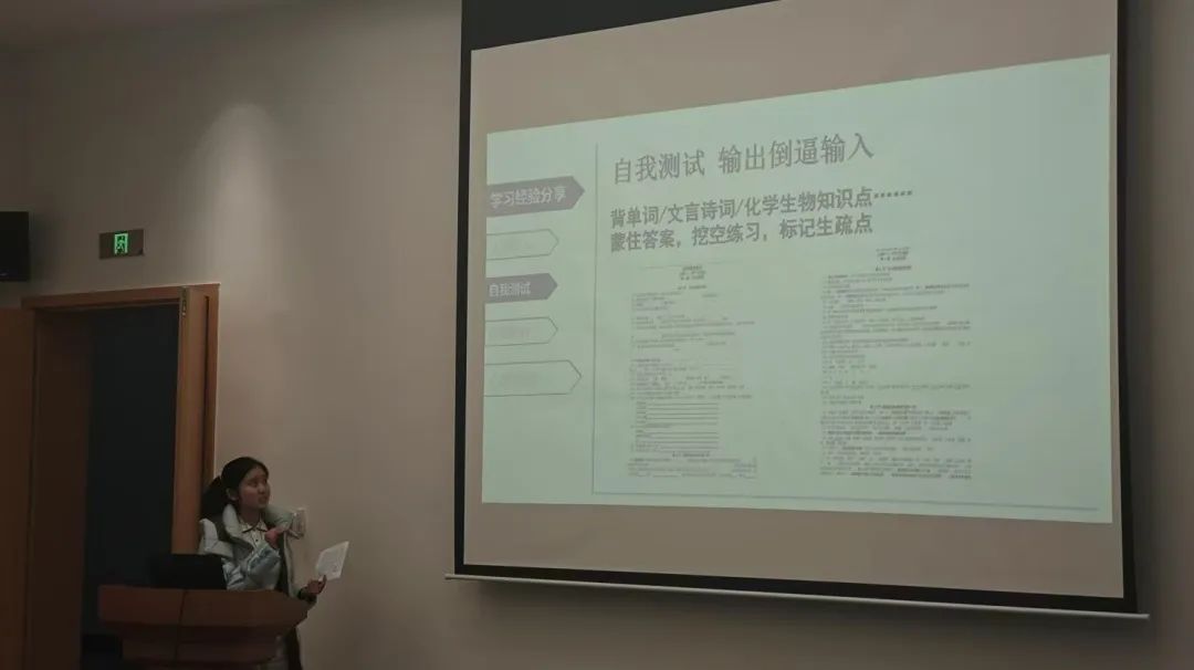 赵颀颖同学别出心裁,率先引入“反馈”概念,指出正向反馈能激发行动力,负向反馈则能引导正确的行动路径。随后,她分享了“自我测试”与“错题统计”等实用方法,助力学弟学妹们精准查漏补缺,提升学习效果。