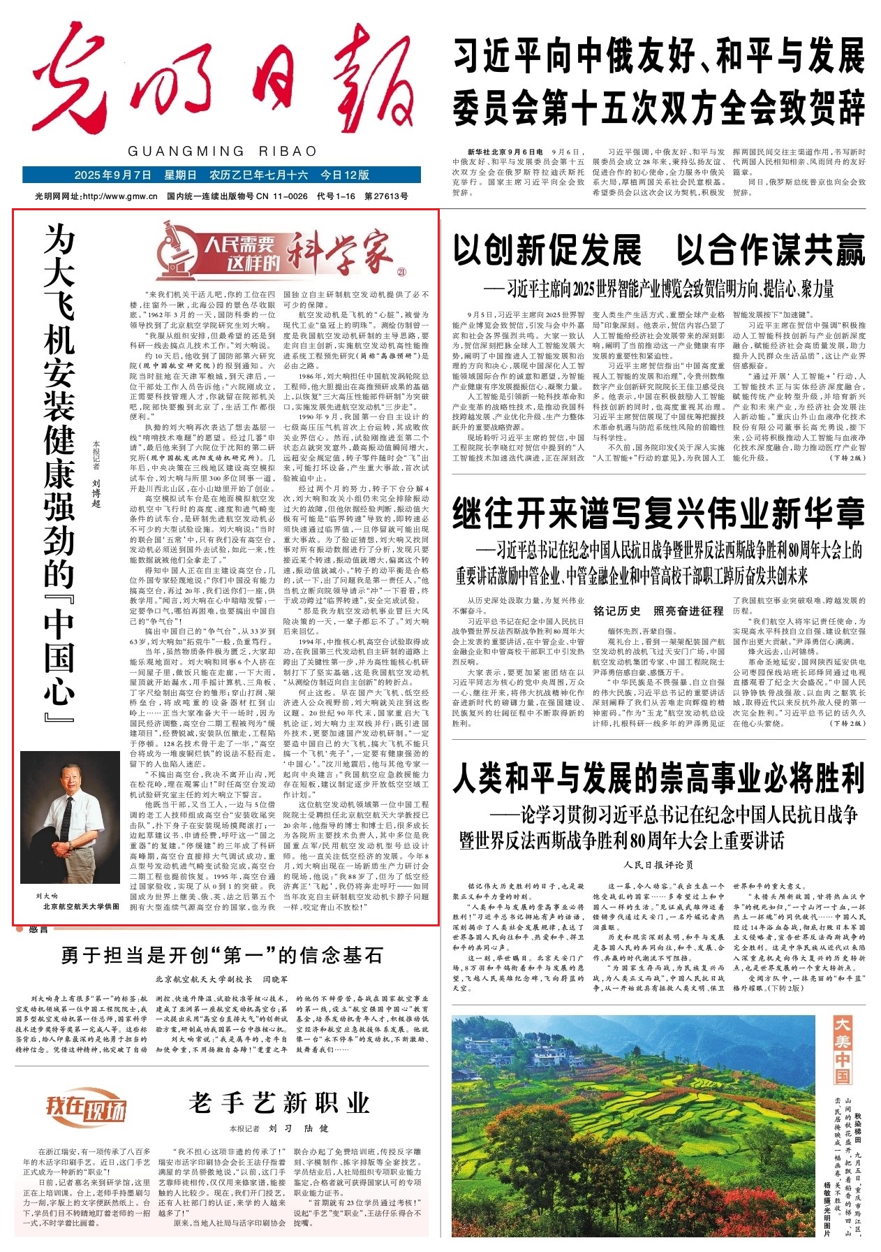 《光明日报》头版头条【人民需要这样的科学家】栏目刊发我校刘大响院士事迹文章:为大飞机安装健康强劲的“中国心”。