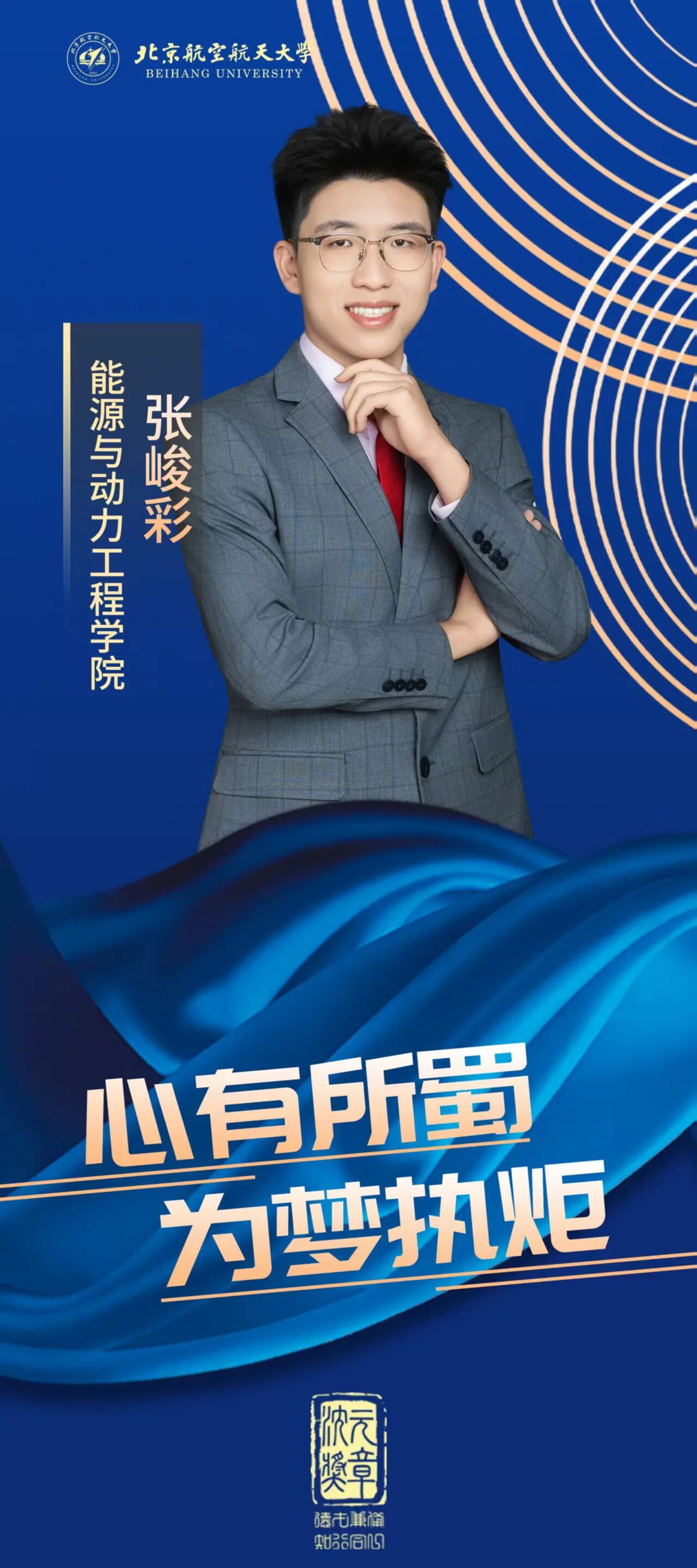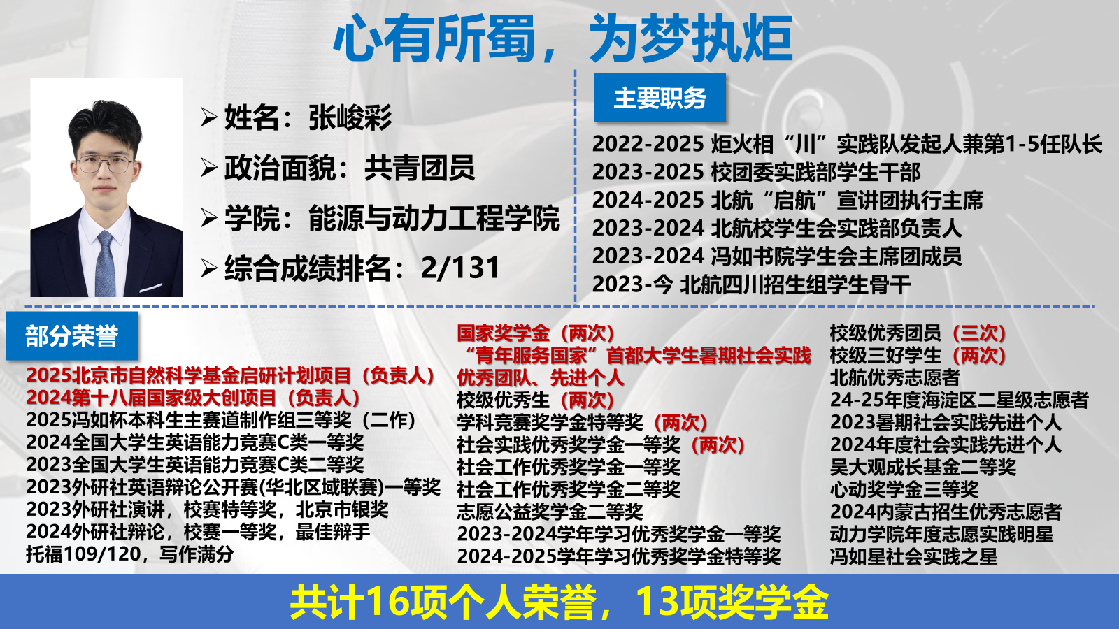 作为吴大观英才班的学子,张峻彩始终铭记“敏行博采,方正大观”的班训,致力于成长为航发科研所需的综合性人才。他学业精进,三年学业与综合成绩均位列专业第二,累积获得国家奖学金等13项奖学金,市级社会实践先进个人等17项个人荣誉,并最终以面试第一的成绩直博航空发动机研究院。同时累计获得全国大学生英语能力竞赛一等奖等10项英语竞赛奖项,为研究生阶段打下了坚实的能力基础。