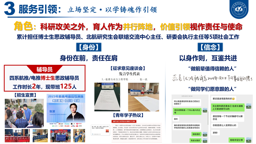 在科研攻关之外,张波把育人视为并行阵地,以实干带动成长、以行动汇聚力量。作为航推/电推博士生思政辅导员,他连续2年扎根一线,负责125人班级日常教育管理与思想引领,做到“班班有人管、事事有回应”。累计开展10余场北航招生宣讲与经验分享活动,线上直播观看量突破2500人次。在服务体系建设方面,他先后荣获北航优秀学生兼职辅导员奖学金特等奖(全校仅12人)等多项荣誉,并以青年骨干身份承担北航研究生会联络交流中心主任、研委会执行主任等5项社会工作,推动校内外资源共建共享。他始终以身作则,努力成为“前辈值得信赖的人、同学们愿意跟的人”。用实际行动凝聚青年、链接青年、成就青年。