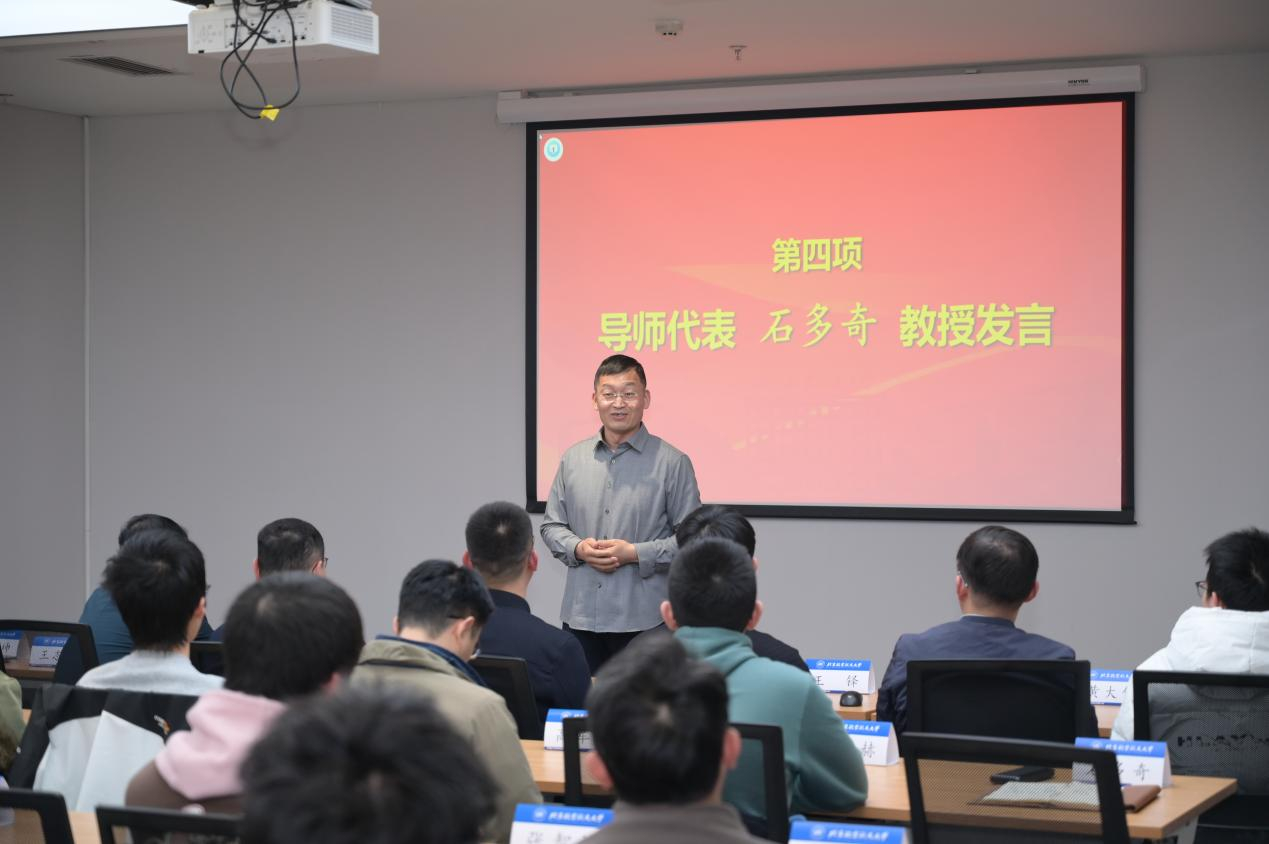 导师代表石多奇教授寄语全体学生,既要永葆探索未知的科研热情,也要有“甘坐冷板凳”的定力,更需培养善抓灵光的悟性,以日积月累的沉淀,成就久久为功的事业。言辞恳切,寓意深远,引来全场热烈掌声。