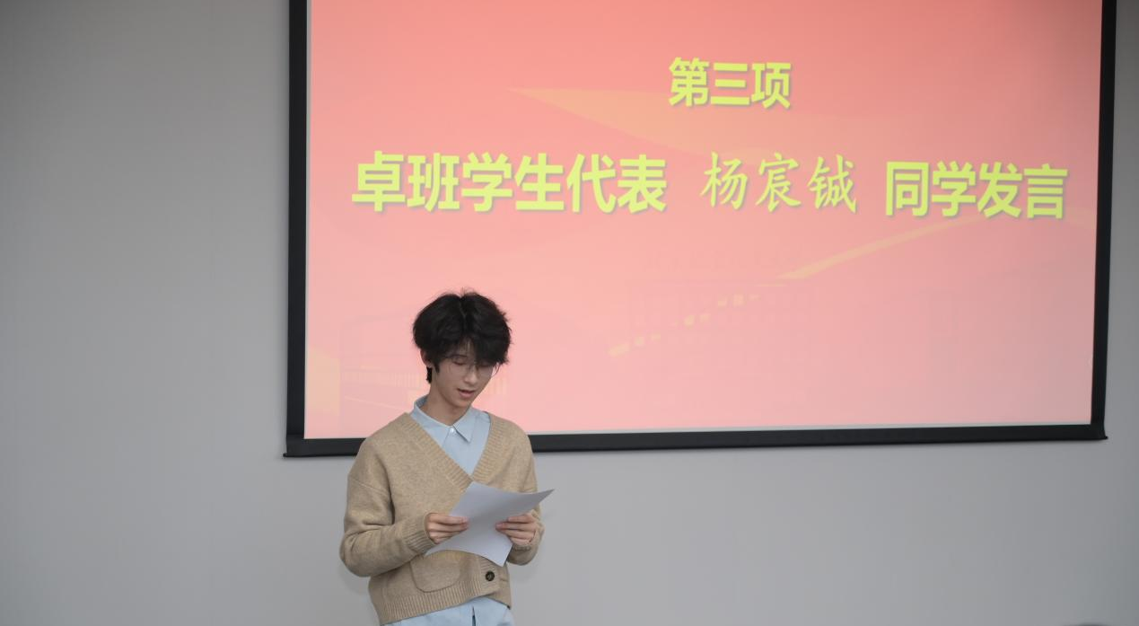 学生代表杨宸铖结合数月来的学习实践,分享了自己的成长体悟与未来展望。言辞铿锵、意气风发,展现了卓班学子投身航空动力事业的坚定信念与青春豪情。