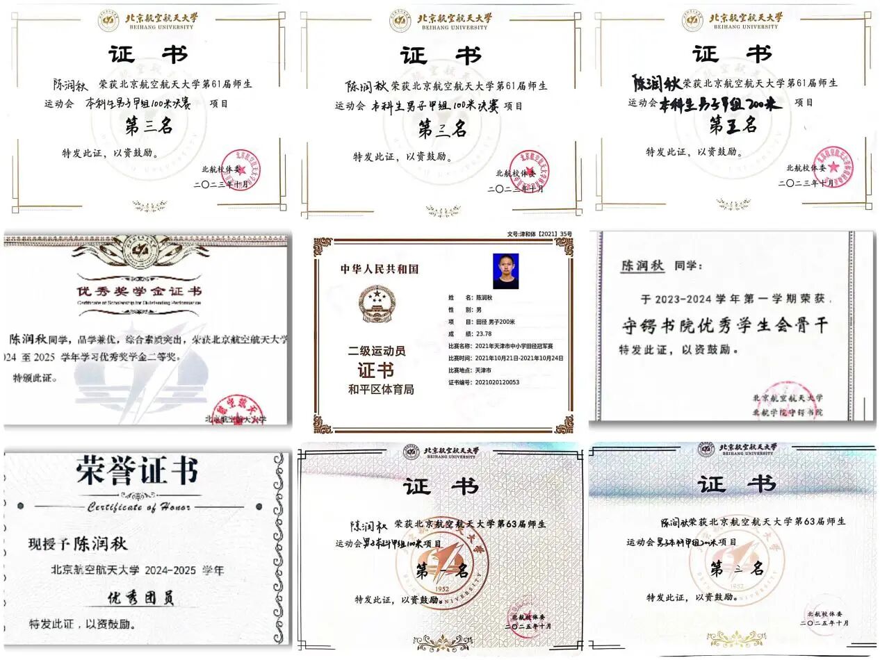 陈润秋,一位从低谷重返巅峰的短跑强者。身为国家二级运动员,他曾因学业暂别赛场,却凭坚定意志与科学训练重拾状态。他在短跑赛道上屡创佳绩:先后夺得校运会百米冠军、二百米季军,三年来总计获得十余枚奖牌,并率领接力队打破校普通生纪录夺冠。他的运动能力不止于跑道,在2025年BUHA飞盘联赛中随队夺冠,于首高接力赛闯入前八,展现出全面的身体素质与竞技适应性。
