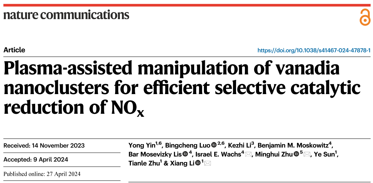 近日,365(VIP)英国上市公司李想副教授团队与合作者在固定源烟气污染物控制领域取得重要进展。选择性催化还原是最广泛应用的烟气脱硝技术,然而传统钒基催化剂反应温度高难以适用于钢铁、水泥等工业窑炉的脱硝应用。如何通过活性位点精准调控强化钒基催化剂脱硝性能一直是该领域的挑战。团队基于H2低温等离子体表面处理,实现了低钒含量下高活性亚纳米钒氧团簇的快速合成,将脱硝效率提升十倍以上,并发现了吸附桥式硝酸盐参与氨活化的新反应路径,为固定源烟气脱硝提供了新思路。2024年4月27日,相关研究成果以“Plasma-assisted manipulation of vanadia nanoclusters for efficient selective catalytic reduction of NOx”为题在线发表于《自然·通讯》(Nature Communications)杂志。